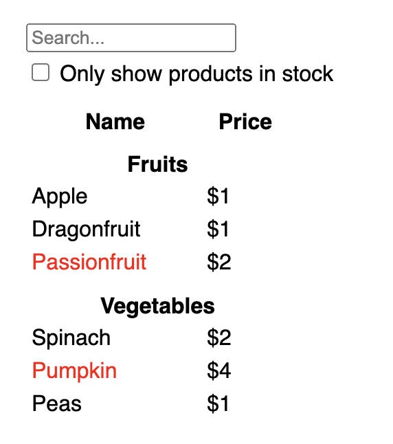 3. ຕັດສິນໃຈວ່າ state ຈະຢູ່ໃສ: ພວກເຮົາຈະຮັກສາ filter text ແລະ checked ເປັນ state ໃນ FilterableProductTable.